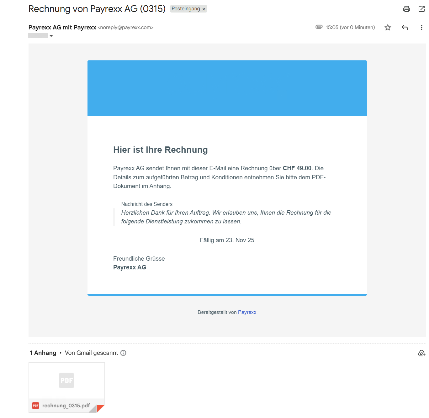 <div align="left"><figure><img src="https://3244062149-files.gitbook.io/~/files/v0/b/gitbook-x-prod.appspot.com/o/spaces%2F-MYJhU4qriZCz_Wxs0T0-543259558%2Fuploads%2F13ioAUQL75wbYehmKUvI%2Fimage.png?alt=media&#x26;token=d37a3fb8-1f8e-49fd-946e-89d185ccef2d" alt=""><figcaption><p>Automatisch von Payrexx zugestellte E-Mail mit Rechnung als PDF im Anhang</p></figcaption></figure></div>