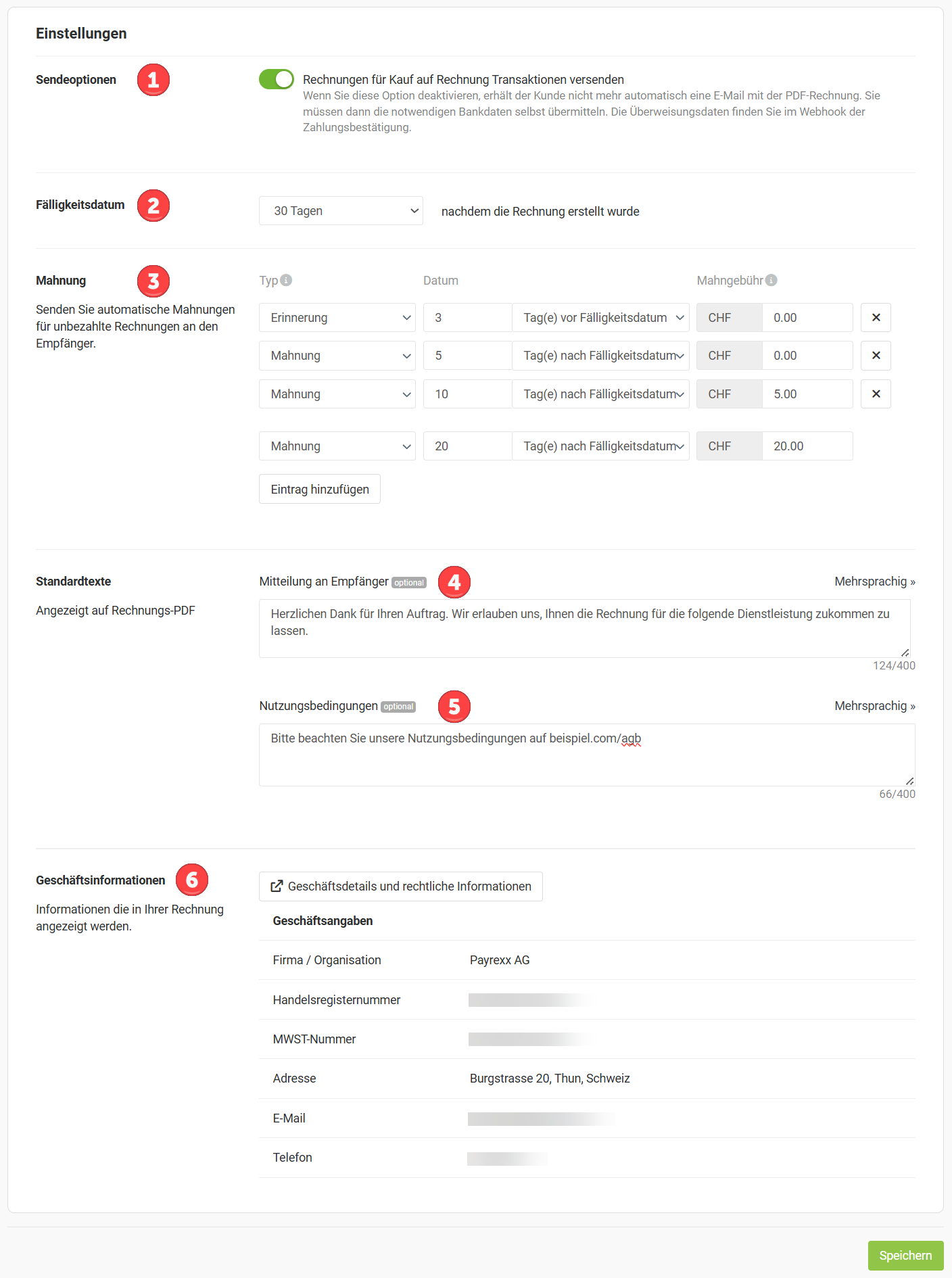 6. **Geschäftsinformationen:** Darstellung der Geschäftsinformationen, die im Fussbereich der Rechnung angezeigt werden. Du kannst diese Informationen in den [Unternehmensdaten](https://docs.payrexx.com/merchant/payrexx-administration/einstellungen/unternehmensdaten) anpassen.