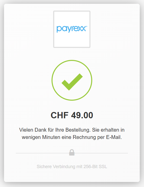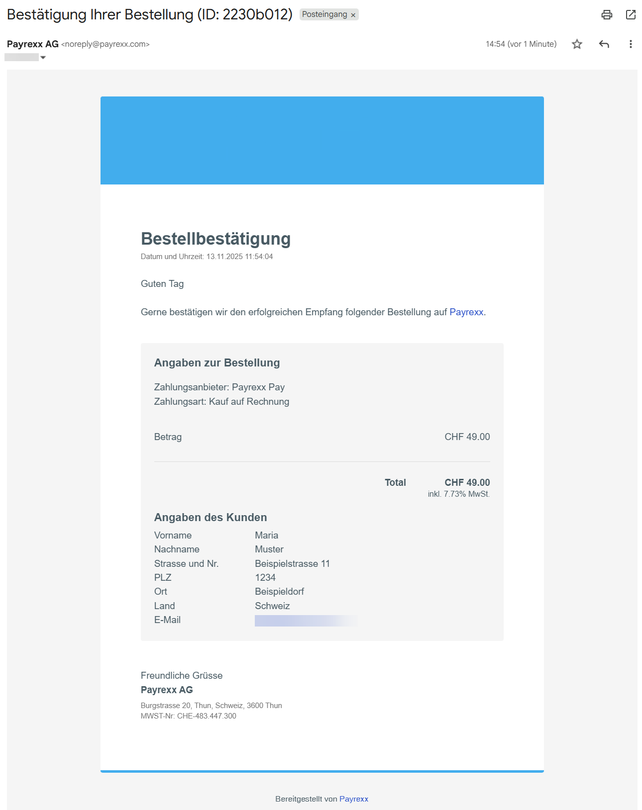 <div align="left"><figure><img src="https://3244062149-files.gitbook.io/~/files/v0/b/gitbook-x-prod.appspot.com/o/spaces%2F-MYJhU4qriZCz_Wxs0T0-543259558%2Fuploads%2FGeHlOALMZZpzu012iz9U%2Fimage.png?alt=media&#x26;token=4108e6f0-e66a-4434-9818-e5852ed6b6a8" alt=""><figcaption><p>Automatisch von Payrexx zugestellte Bestellbestätigung</p></figcaption></figure></div>