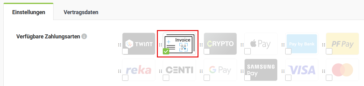 <div align="left"><figure><img src="https://3244062149-files.gitbook.io/~/files/v0/b/gitbook-x-prod.appspot.com/o/spaces%2F-MYJhU4qriZCz_Wxs0T0-543259558%2Fuploads%2FgmKHYmyC8fuQwhDQ4rhk%2Fimage.png?alt=media&#x26;token=e8fac3e6-215d-453d-9f3a-ccbae9ae3398" alt=""><figcaption><p>Aktivierung des Zahlungsmittels "Kauf auf Rechnung" innerhalb von Payrexx Pay</p></figcaption></figure></div>
