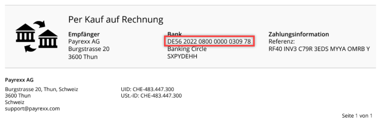 Die auf der Rechnung ersichtlichen Bankangaben sind nicht Deine, sondern die von Payrexx. Dies liegt daran, dass der Betrag zunächst auf Dein Payrexx-Konto überwiesen und erst anschliessend auf Dein Bankkonto ausbezahlt wird.