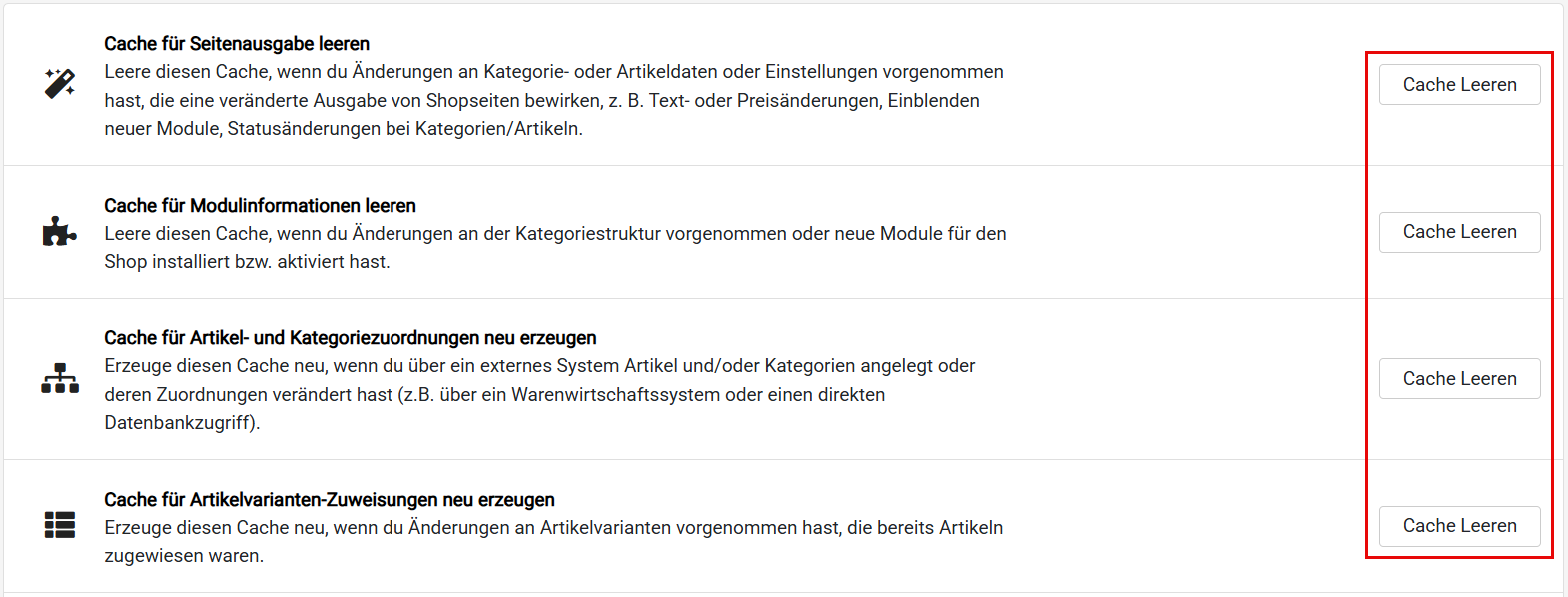 <div align="left"><figure><img src="https://3244062149-files.gitbook.io/~/files/v0/b/gitbook-x-prod.appspot.com/o/spaces%2F-MYJhU4qriZCz_Wxs0T0-543259558%2Fuploads%2FHkWw5l1UrfhcxUJ5odEe%2Fimage.png?alt=media&#x26;token=bb5dfdf4-b559-4c80-9cd5-10c94534ed9b" alt=""><figcaption><p>Leeren sämtlicher Caches in Gambio</p></figcaption></figure></div>