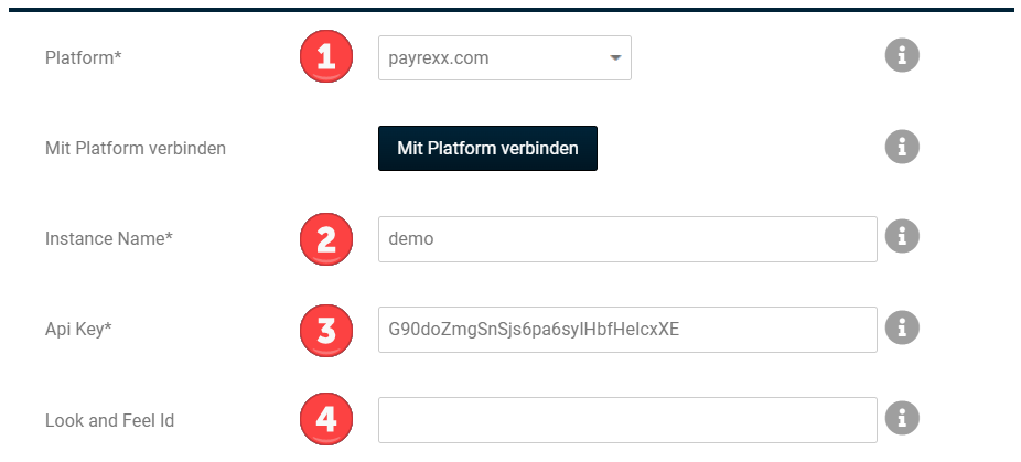 * Fülle die folgenden Felder aus, um die Verbindung zu Payrexx manuell herzustellen: