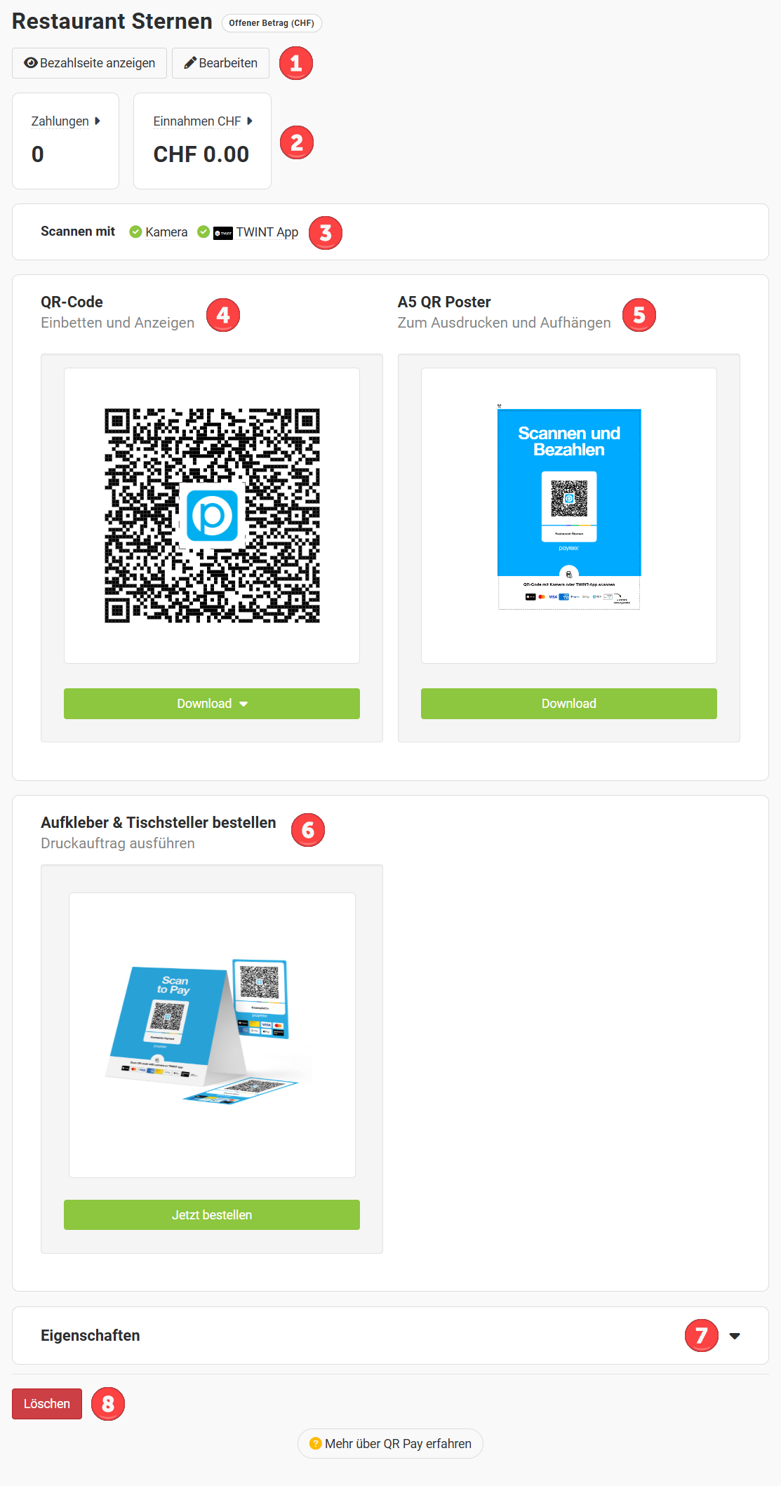 1. **Bezahlseite anzeigen und Bearbeiten:** Klicke auf "Bezahlseite anzeigen", um zu sehen, was dem Kunden angezeigt wird, nachdem er den QR-Code scannt. Klicke auf "Bearbeiten", um die Einstellungen des QR-Codes zu ändern.