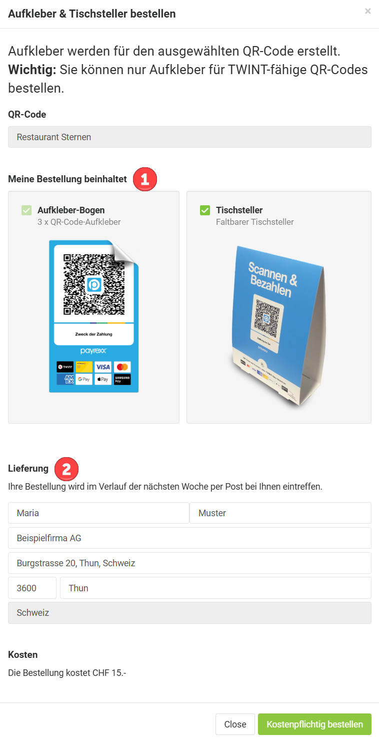 <div align="left"><figure><img src="https://3244062149-files.gitbook.io/~/files/v0/b/gitbook-x-prod.appspot.com/o/spaces%2F-MYJhU4qriZCz_Wxs0T0-543259558%2Fuploads%2FlH4Sy75uWgqDyhPurzfw%2Fimage.png?alt=media&#x26;token=5ec8e8fc-adcb-4224-9b57-8cdbe45893c4" alt="" width="563"><figcaption><p>Bestellung von Aufklebern und Tischsteller abschliessen</p></figcaption></figure></div>