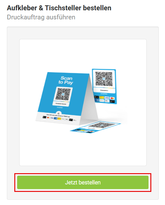<div align="left"><figure><img src="https://3244062149-files.gitbook.io/~/files/v0/b/gitbook-x-prod.appspot.com/o/spaces%2F-MYJhU4qriZCz_Wxs0T0-543259558%2Fuploads%2FqBuzco9XOAzCyxYuGzvZ%2Fimage.png?alt=media&#x26;token=e89566e9-ca18-4348-bcf2-1cbad2c7db5e" alt="" width="398"><figcaption><p>Bestellung von Aufklebern und Tischstellern starten</p></figcaption></figure></div>