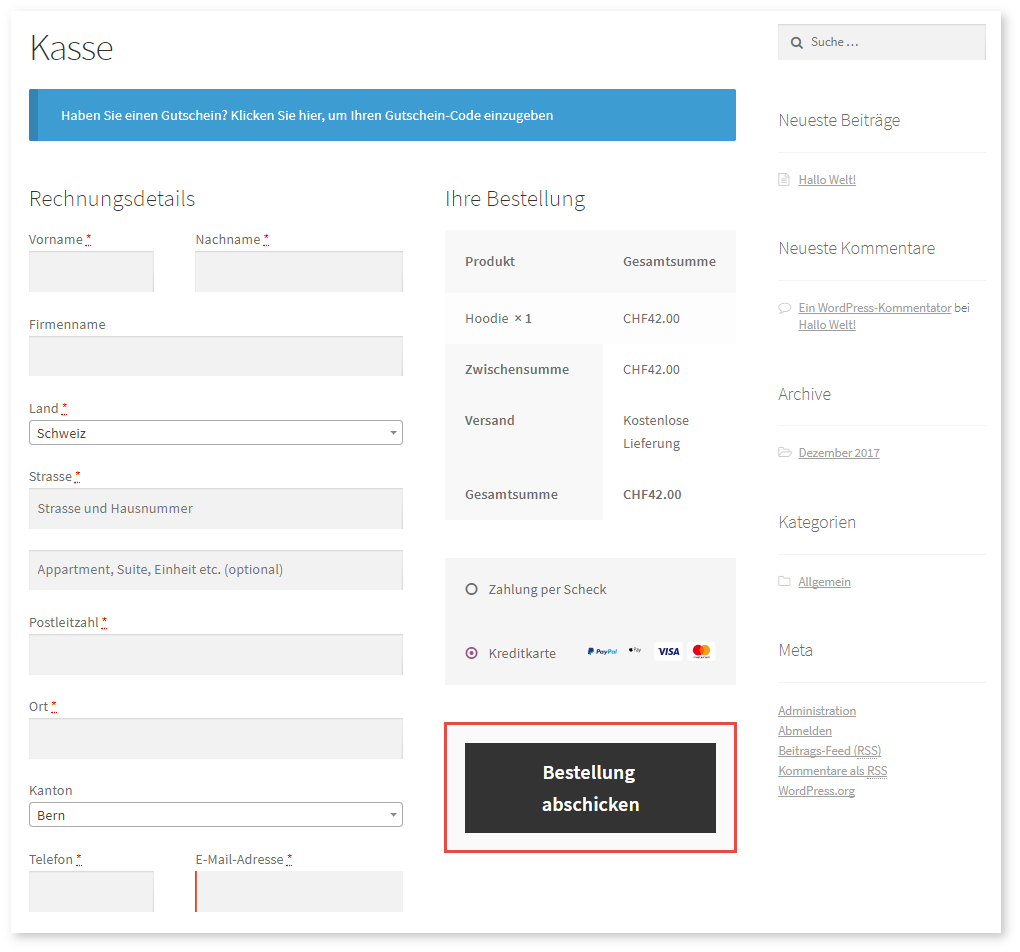 Nach der Überprüfung seines Warenkorbs fährt der Kunde weiter zum Checkout: