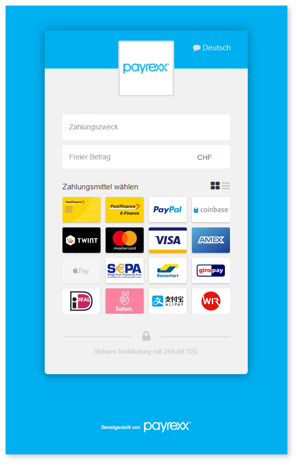 Der Kunde wird zur Bezahlseite von Payrexx weitergeleitet, wo er die Zahlung abschliesst: