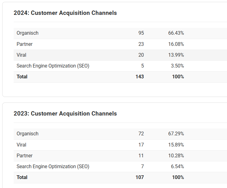 The Customer Acquisition Channels tab displays the most successful customer acquisition channels per year: