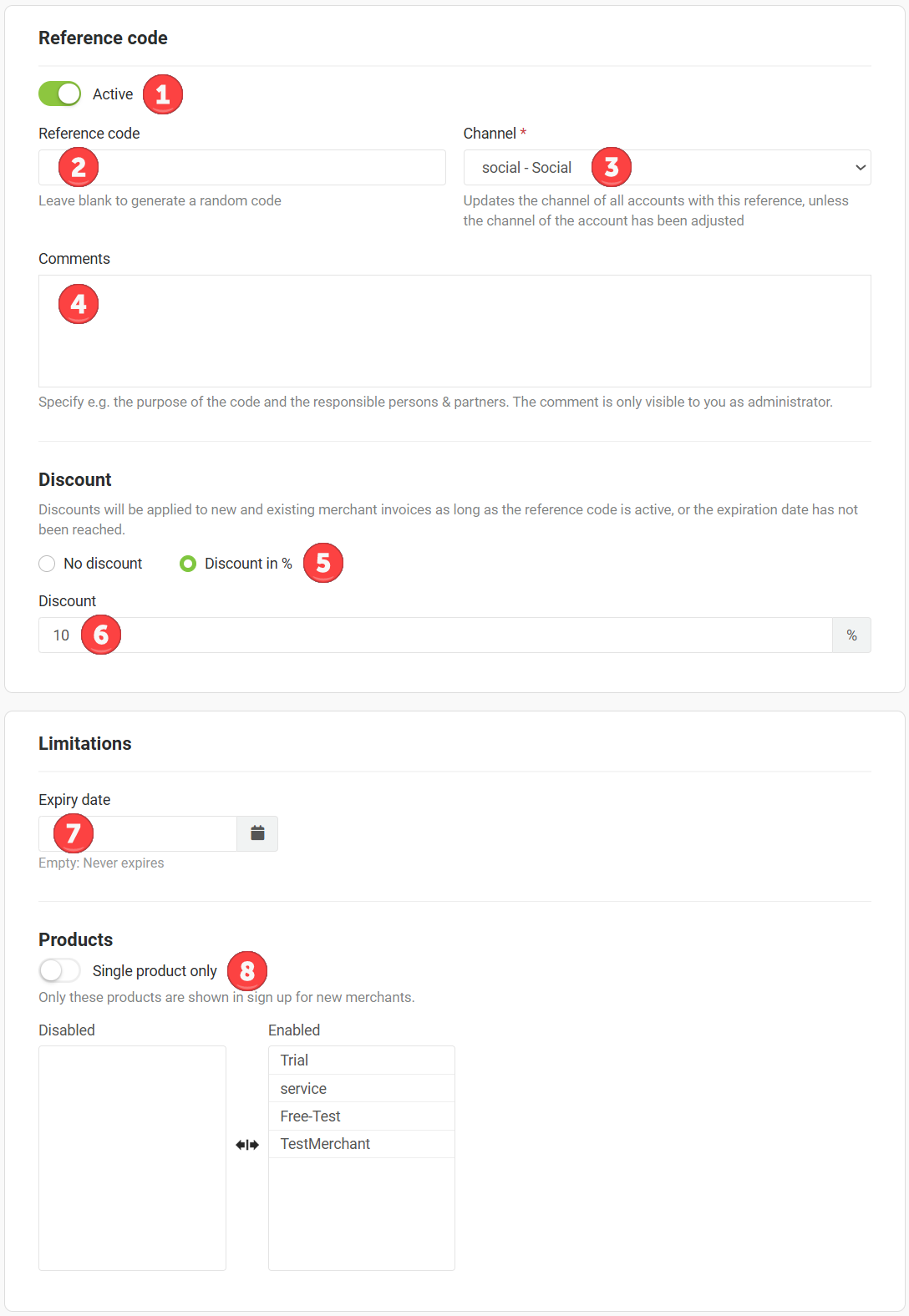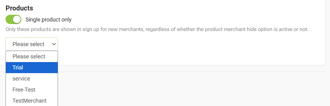 Here you can select which products will be displayed during registration via your reference code. If you enable the toggle, the selected product will automatically be assigned to the registering merchant.